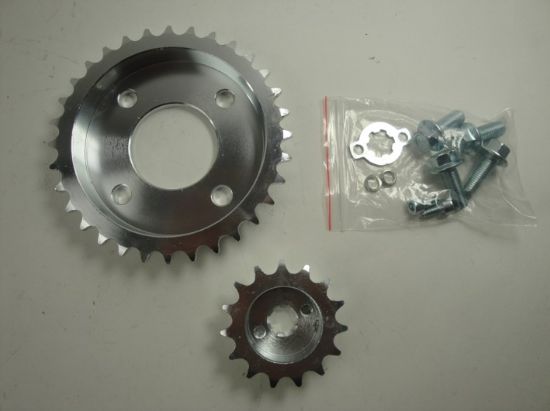 Deze set bestaat uit: Achtertandwiel met 4 gaten 32 Tands, |Voortandwiel 15 Tands (voor 420 ketting)